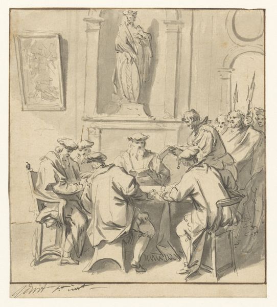 Pieter Tanjé made this drawing of pen and brown ink in the mid-18th century. This is a preparatory design for an illustrated title page, contrasting Nicolas Poussin’s classical subject of Arcadian Shepherds above with the figure of Moses, lawgiver of the Old Testament, below. This pairing of pagan and Christian figures reflects the 18th-century Enlightenment interest in harmonizing classical aesthetics with religious tradition. The image engages with debates of the time around the place of religious and classical subjects in contemporary art. Tanjé may be self-consciously commenting on the institutional preference of academies for one or the other. Or, perhaps, he is subtly critiquing the rise of secular humanism in intellectual circles. Understanding this drawing fully requires delving into period writings, theological tracts, art academy records, and artistic biographies. The social and institutional contexts are crucial for interpreting the artistic choices made here.
