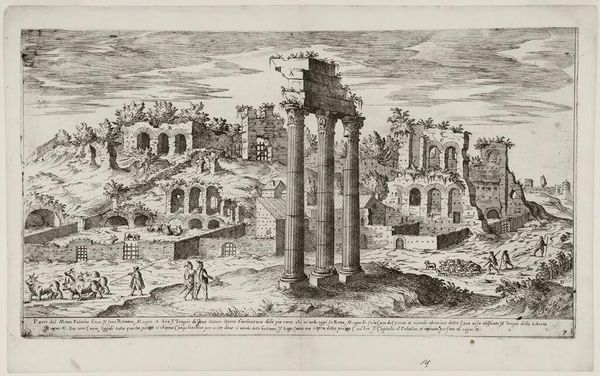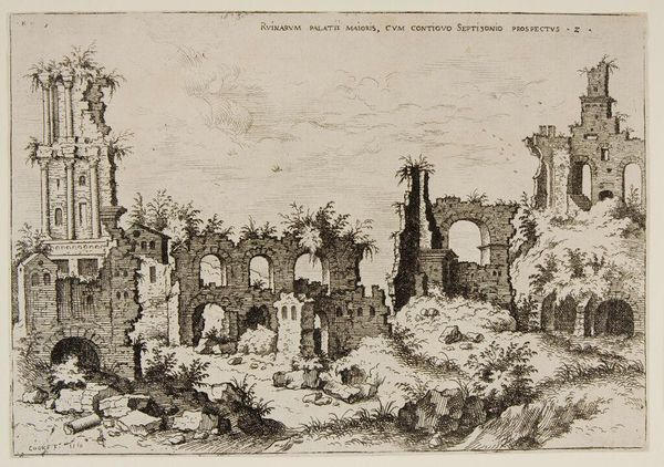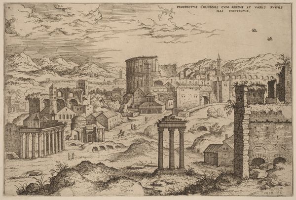 Curator: The first impression I get is a stark, yet strangely serene, cityscape rendered in monochrome. It feels both ancient and timeless. Editor: Indeed. What you are looking at is Hieronymus Cock's "View of the Colosseum and Adjacent Ruins". Cock, who lived from 1510 to 1570, captured this scene in an engraving, preserving a moment in Rome's evolving urban narrative. Curator: Narrative is right. You see the iconic Colosseum looming in the background, but the foreground is all ruins, almost swallowed by the earth. It makes you wonder what stories those stones could tell if they could talk. Editor: That tension between the celebrated monument and the decaying remnants of its surroundings speaks volumes. It's a visual commentary on the passage of time and the cyclical nature of power and decay, very much a reflection of the 16th century's engagement with its classical past. Curator: Absolutely. It's a powerful statement about how even the grandest empires eventually crumble, leaving only whispers of their former glory. It makes one ponder our own fleeting presence in the grand scheme of things. Editor: It's also fascinating to consider how this image circulated – as a print, it brought a vision of Rome to those who might never experience it firsthand, shaping perceptions and reinforcing Rome's cultural significance. Curator: It is a reminder that even in ruins, beauty and meaning can be found, if one is willing to look closely. Editor: Precisely. And perhaps even find a bit of ourselves.