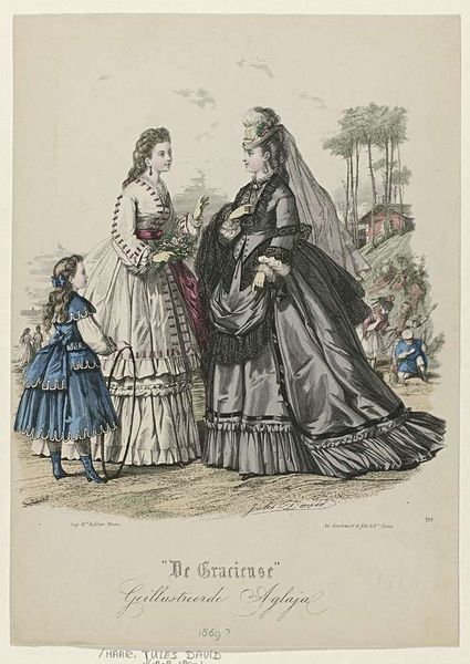 Huard's "La Mode Illustrée, 1870, No. 19: Toilettes de Mme Fladry (...)" is a hand-colored print, showcasing the fashions of the time. At first glance, the detailed rendering of textiles captures the eye, inviting a close examination of the interplay between color and form. Notice how the artist uses line and color to define the shapes of the dresses. This technique gives volume and texture to the ruffles and folds. The print relies on a carefully orchestrated composition where each figure is precisely placed to guide the viewer's gaze from left to right. The work functions as a visual code, reflecting societal values and the semiotics of fashion. It encapsulates the era's obsession with detail and ornamentation. While seemingly documenting fashion, the artwork also subtly interrogates notions of identity and representation. It prompts us to question how appearances construct cultural narratives and meanings.