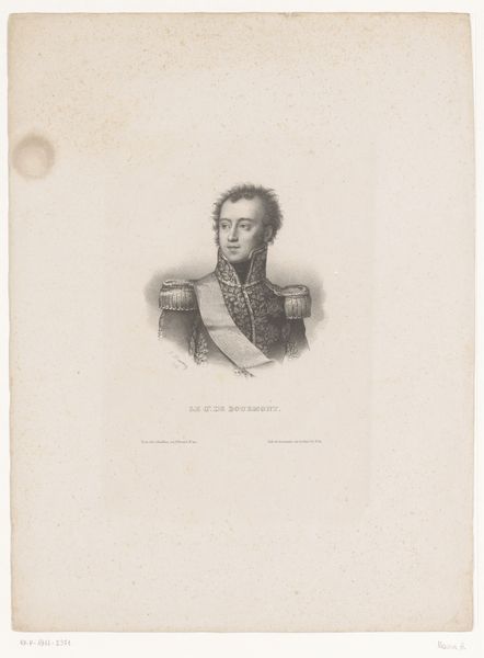 Curator: Here we have Nicolaas Pieneman’s "Portret van Jacob Hobein met vlag," dating roughly from 1831 to 1853. It’s a drawing on paper, or rather an engraving, currently held in the Rijksmuseum. Editor: My initial impression is one of slightly mournful nobility. There’s a certain softness to the lines that makes him look a bit vulnerable despite his rather imposing posture. The flag looks almost spectral, like a memory or aspiration. Curator: The spectral flag is indeed evocative. Pieneman employs the flag as a symbol of status and possibly patriotic identity, typical for portraits during the period of Romanticism. Notice the detail in his military attire, the meticulous depiction of the uniform and the medals, all adding layers to his persona. Editor: The rendering of those medals is superb; little sunbursts of meticulous linework. The man is more than the flag. To me the crossed arms project a defensiveness, a hidden anxiety perhaps at odds with the flag’s grand symbolism. What do you read in that body language? Curator: His crossed arms might suggest that psychological reading. It’s true. But the gesture was conventional for formal portraits of the era. It served to structure the composition. We must consider social conventions when analyzing such artworks. He's a man presented in his most honorable and respected form. Editor: Conventions aside, every pose leaks a little something genuine, don't you think? Look how gently his gaze rests. He feels more introspective than aggressively proud. The symbolism clashes beautifully with the quiet melancholy I perceive. Curator: And that contrast you pointed out between vulnerability and military bearing captures something interesting about the tensions of early 19th-century society—personal feelings set against public expectations. Pieneman manages to communicate not only the likeness but a particular cultural mood. Editor: He does, indeed. And looking at the gentle rendering and those soulful eyes I want to believe that his is more than just another face frozen in the formality of patriotic convention. Curator: I agree. Art allows for precisely these layers of meaning, individual and cultural. The artwork allows us a peep-hole into history! Editor: Precisely! Now that's what a truly thought-provoking visit to the museum should look like.