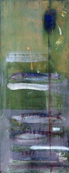 Curator: Looking at John Wells' painting, titled "Microcosm," I'm immediately struck by the texture. It feels almost geological, like looking at layers of sediment. Editor: The layering is interesting, isn’t it? It makes me think of palimpsests, where old meanings are erased, and new ones written over, but traces of the past still shimmer through. What symbolic elements jump out at you? Curator: Well, the title itself "Microcosm" suggests a world-within-a-world, everything is interconnected. Do you see how the forms are both abstract and suggest land, sea, and sky? It feels very elemental. Editor: And it seems that Wells has worked and reworked the surface. The visible marks and subtle changes in tone speak to a really involved artistic process, constantly building and excavating. Curator: Perhaps that process reflects the idea of a microcosm, constantly evolving and revealing itself through time. It reflects the artist, nature, and the human condition. Editor: It makes you wonder about the tools and the pigments used—were they locally sourced? How did those choices contribute to the final impression? Curator: It's intriguing how a small artwork can hold so much. Editor: It certainly gives you a lot to think about.