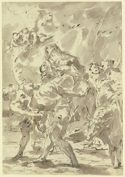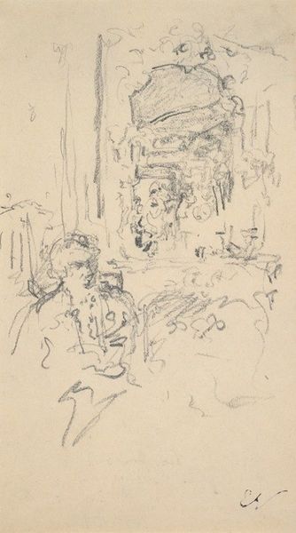 Editor: This is James Ensor’s “The Death of the Holy Virgin,” an ink drawing from 1885-1886. The scene feels chaotic, yet somber, almost as if Ensor is capturing a private, grief-stricken moment. How do you interpret this work, especially considering its historical context? Curator: Well, considering Ensor's position within the avant-garde movements of the late 19th century, it’s crucial to examine how this piece subverts traditional religious iconography. Instead of the idealized serenity often associated with depictions of the Virgin Mary’s death, we have this frenetic, almost grotesque scene. Notice the almost caricatured faces of the mourners. To me, that is quite pointed, even daring. Do you think this challenges the church's narrative or reinforces the pathos? Editor: I can definitely see your point about the almost grotesque depictions, but to me, this evokes empathy instead of, let's say, condemnation. Is this contrast something typically seen in his pieces? Curator: It’s a hallmark of Ensor's style – he juxtaposes the sacred with the absurd. Considering the growing anti-clerical sentiments during that time, particularly within artistic circles, the artist's social commentary takes precedence over religious sentiment. We see an unraveling, perhaps even an intentional desecration of revered icons of society, including the Virgin Mary as symbol of devotion, to mirror the changing values. It forces a reconsideration of power structures and belief systems. Editor: So, it’s not necessarily about religious belief but more about the socio-political climate reflected in religious symbolism? That’s really interesting, something I wouldn’t have noticed. Curator: Exactly! Art serves as a mirror reflecting and refracting the socio-political anxieties of its time. Looking closer has truly changed how I view the work too, the artist's daring choice of medium as well reflects their intention, adding complexity to our understanding of art's relationship to society.