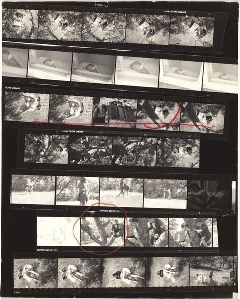 Robert Frank produced this gelatin silver print, titled Convention 28, without a specified date. The contact sheet shows the photographer's selection process, marked with red grease pencil. Born in Switzerland, Frank brought an outsider's perspective to the American social landscape. His work questions the mythologies of postwar American prosperity, revealing undercurrents of alienation and inequality. Frank's images often capture transient moments, and everyday scenes that speak to broader social issues. In this picture, what kind of convention is this? What statements are made by its participants in their environment? The red markings highlight Frank's curatorial decisions, emphasizing certain narratives or themes within the series. A historian examining this work might consult Frank's correspondence, critical reviews, or the archives of institutions that exhibited his photographs to better understand the cultural and institutional context that shaped his photography and its reception.