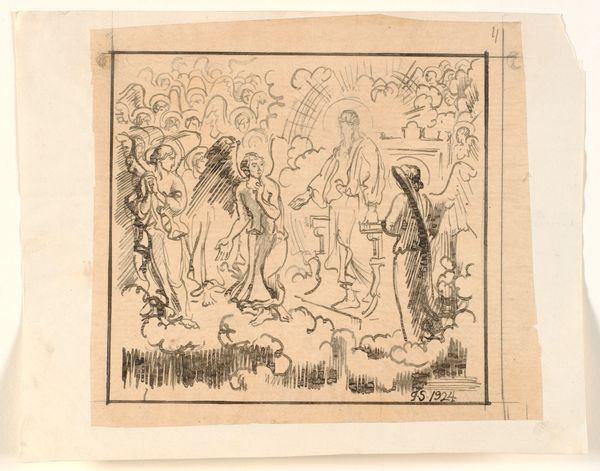 Curator: Here we have Joakim Skovgaard’s 1923 ink drawing, "Saul's Conversion," currently held at the SMK, the National Gallery of Denmark. What’s your initial impression? Editor: Chaos! Utter disarray. There's a palpable sense of something earth-shattering happening. Curator: Indeed. Notice how Skovgaard uses line weight to emphasize certain figures. Saul and his mount, in the throes of collapse, are rendered with thick, frenetic strokes. This contrasts with the more ethereal figure in the upper left. Editor: That contrast is fascinating. It speaks volumes about the divine versus the earthly. Saul, representing earthly authority, is literally brought to his knees. The symbolism is heavy, with the tumbling horse representing the fall from power. Curator: Consider the spatial relationships. The figures on horseback are clustered, almost frozen, while Saul's prostrate form anchors the scene. This composition divides the world into "before" and "after" Saul's spiritual awakening. Editor: And those radiating lines! They strike me as beams of divine light, literally piercing through the scene. It’s a direct visual representation of divine intervention and the overturning of a life’s direction. Are those figures above bystanders, observers? Or part of Saul's troop? Curator: Their expressions are obscured, but I’d suggest the artist is less interested in individual reaction and more focused on capturing the overwhelming moment of transformation. Also, consider how Skovgaard confines the dynamism within a rather tight, self-contained space. Editor: This enclosure, intentional or not, seems to underscore the idea that such seismic personal change happens within the individual soul, yet it affects the space that is inhabited. Curator: Exactly. By examining its composition and contrasting lines, we can dissect the power within this artwork, beyond a simple illustrative scene. Editor: Delving into those stark lines and the symbolism, it all highlights the profound disruption that's at the core of the narrative – and its emotional endurance through time.