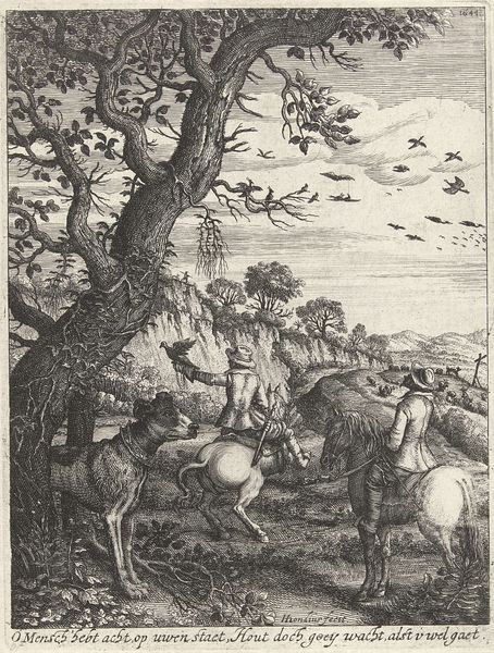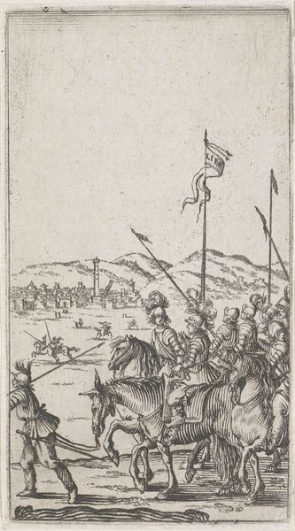 Editor: This pen and ink sketch, "Landscape with Soldiers and a Cart Pulled by Cattle," dates from between 1620 and 1664 and is held at the Rijksmuseum. It's such a flurry of activity! What immediately strikes me is the varied texture created just through line work. What do you see in this piece? Curator: Looking at the lines, the sketch prioritizes the display of materials – armor, textiles, even the wooden structure of the cart. Notice how the artist renders each differently, perhaps reflecting the social hierarchy encoded within these objects. What about the oxen, shrouded in what looks like striped cloth? Are they livestock or are they themselves being materially transformed into commodities of war? Editor: That's a striking observation! I hadn’t thought about the oxen’s covering that way. So, it’s less about the "landscape" and more about the labor and materials being mobilized for war. Curator: Exactly. Consider the societal resources – animal power, human skill, available metals and textiles – all channeled into this procession. Even the pen and ink themselves speak to systems of trade and access. Editor: It really reframes how I see these older works, thinking less about idealized scenes and more about what they reveal about the processes and labor behind the images. I didn’t initially consider this piece’s value to stem from its sketchbook form as a testament to that process! Curator: Precisely, shifting our focus from subject matter to material conditions opens up rich new avenues for understanding art and its role in shaping the world. I wonder what other sketchbook work would inform your new vision… Editor: Thanks! I'll definitely carry this perspective with me as I continue exploring other works from this era.