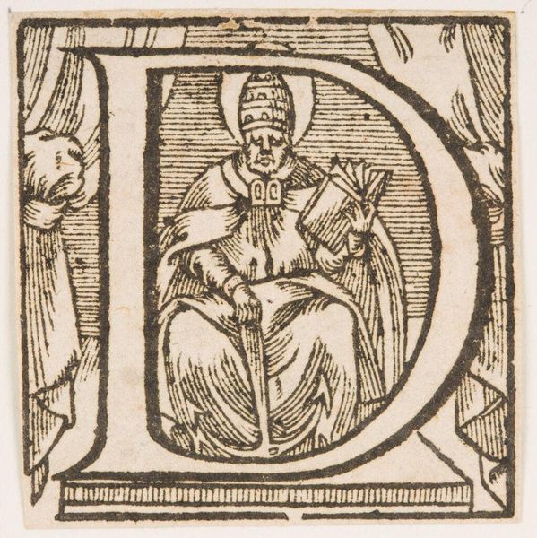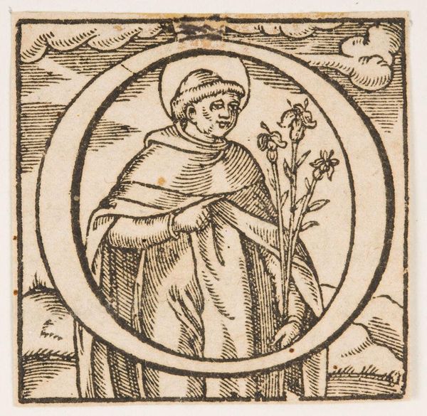 Curator: Here we have "Letter C", an intriguing woodcut from an unknown artist, housed here at the Harvard Art Museums. Editor: The crisp black lines against the paper give it a really striking graphic punch. It almost feels like a secret symbol, doesn't it? Curator: Indeed. The letter enfolds a figure carrying a quill, surrounded by clouds and geometric shapes. It’s like he is building the letter itself. Editor: The details, like the texture of his robes and that feathery quill, are so precise. It adds a layer of depth to what could have been a simple initial. Curator: Consider this as a fragment of something grander, a testament to the artistry of printmaking. Editor: It's incredible how a single letter can tell such a vivid, intricate story.