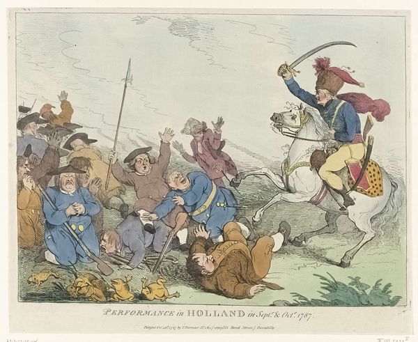 This anonymous print, "Daine op de vlucht", was made in 1831, and employs etching and possibly other techniques. It depicts a scene related to the Belgian Revolution, and likely functioned as political propaganda. The image lampoons General Daine, commander of the Dutch forces in Brussels during the uprising. We see him fleeing on horseback, scattering papers labeled "mutiny". Note the broken stone, and the Belgian flag lying on the ground, these are visual indicators of the revolution. In the background, Dutch volunteer soldiers advance. It’s important to remember that images like this played a significant role in shaping public opinion during times of conflict. Cartoons and prints could quickly disseminate political messages, influencing popular sentiment and contributing to the construction of national identity. To understand this image fully, we need to consult historical records, political pamphlets, and period newspapers to reconstruct the context in which it was created and consumed. Only then can we appreciate its full impact as a piece of social and institutional history.
