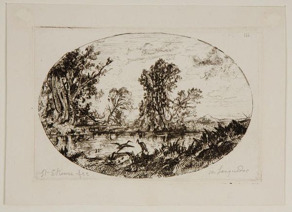 Editor: Here we have a ceramic platter, dating from 1822 to 1837, created by James and Ralph Clews. It features a transfer-printed landscape scene, very pastoral. The monochrome palette and the bustling composition almost make it look like an advertisement, albeit for an antiquated version of “country life”. What do you make of it? Curator: I think you’re right to pick up on the ‘advertisement’ quality. Pieces like this were immensely popular in England and America at the time. While seemingly innocent depictions of rural life, they also subtly reinforced ideas about nationhood and belonging, even as industrialisation transformed lived experience. The very act of consuming imported ceramics became a signifier of cultural aspiration and a stake in an imagined community. Do you think this reinforces social stratification? Editor: That's fascinating. I hadn't thought about the consumption aspect. The romanticised landscape is one thing, but the fact it's on a mass-produced platter adds another layer. Perhaps it presents a simplified view of social structure and harmony to distract from societal tensions, with a rural ideal available through commerce. Curator: Exactly! This manufactured, picturesque landscape papers over the realities of labor and class division, promoting a national identity built on consumption. The imagery on the plate becomes a stand-in for authentic experience. It’s important to consider these objects not just as decorative items, but as active participants in constructing and maintaining social hierarchies. Does that make you look at the decoration on the plate differently? Editor: Absolutely! It makes me consider who could afford this platter, what kinds of homes it was displayed in. Thanks, it is fascinating how even decorative arts have social implications we might miss at first glance! Curator: My pleasure!