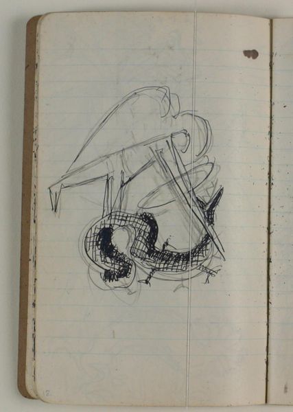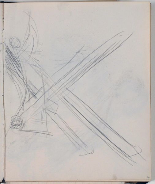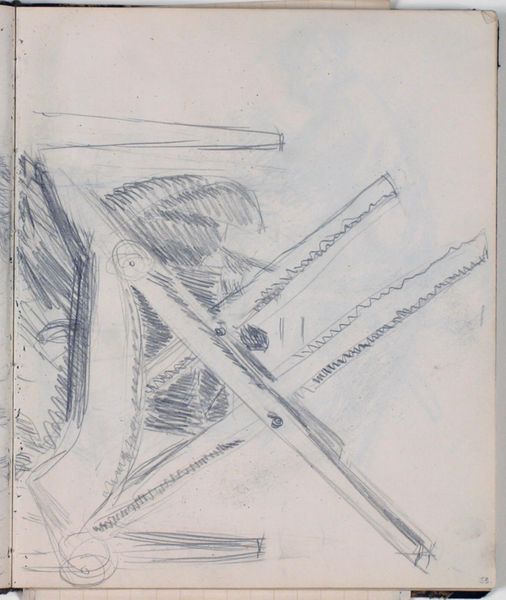 Niels Larsen Stevns created this sketch, "Studie af en rygvendt mand siddende i en klapstol", with graphite on paper. The drawing captures a figure seated in a folding chair, but it's the chair's geometry that dominates our attention. The chair's structure forms a compelling composition. The lines create a series of intersecting planes, which draw the eye across the page. Notice the contrast between the defined edges of the chair and the loose, scribbled lines of the figure. This juxtaposition raises questions about form and function; are we observing a person, or the architecture of the everyday object they occupy? The sketch embodies a semiotic tension between representation and abstraction. The chair, a functional object, is rendered with such focus on its abstract qualities, that it challenges our understanding of its purpose. Is it a study of form, of negative space, or an exploration into how simple lines can suggest depth and volume?