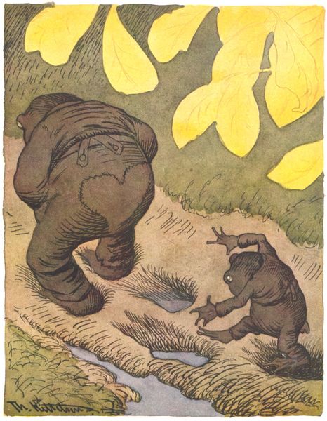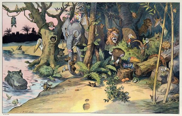 Theodor Severin Kittelsen created "Innfoedte Av Majoristammen" using ink and watercolor, presenting a scene teeming with peculiar characters. The composition is divided into two distinct zones. In the foreground, a frog-like creature lies supine, seemingly lifeless, with insects crawling upon it, while an empty bottle suggests a tale of debauchery. Behind this tableau, a cluster of beings with varied morphologies peer out from tall grasses, their large eyes suggesting curiosity or perhaps voyeurism. Kittelsen uses the formal arrangement to destabilize conventional perspective; scale is distorted, and the figures blend, challenging our perception. The work seems to question the boundaries between observer and observed, reality and fantasy. The interplay of light and shadow, combined with delicate lines and muted tones, invites us to reflect on the darker, often unseen, aspects of human nature. This artwork invites endless interpretations, reflecting how art perpetually challenges fixed meanings.