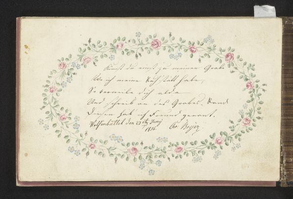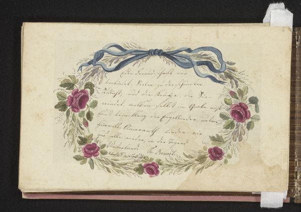 Curator: What strikes me immediately about this piece is its ethereal, almost lace-like quality. The intricate cutouts create a delicate composition against a soft blue backdrop. Editor: We are looking at "To Esther (Valentine)", a drawing, print and miniature made by Joseph Mansell around 1850. It resides at the Art Institute of Chicago and offers a fascinating glimpse into the social rituals around courtship. Curator: The figures of the man and woman, framed by a dense screen of foliage, carry heavy symbolic meaning about class and respectability at the time, don't you think? It's a deliberate visual language being used to convey very specific values. What else catches your eye about this piece from an aesthetic standpoint? Editor: The contrast between the open oval in the center, filled with handwritten verse, and the intricate silhouette work surrounding it is wonderfully dynamic. Semiotically speaking, that vacant, bright space isolates the text. Curator: Indeed, and those verses are key to understanding its socio-cultural impact; their emotional tone gives nuance to how men are taught to engage with and pursue relationships with women, an unequal social arena fraught with peril and often dictated by class and family expectations. It acts almost as a tangible relic of assigned gender roles in the Victorian era. Editor: The execution is impressive—a testament to skill with scissors or a knife. To look closely, as any structuralist critic might argue, is to understand how this small format artwork achieves a complex balance through its arrangement of void and solid spaces. Curator: For me, the artist's labor gestures towards love and devotion itself, mirroring societal values. It becomes a social commentary and evidence of its place within an important narrative. Editor: Ultimately, this "Valentine" by Joseph Mansell offers multiple layers of interpretation and reveals complexity of composition, use of textual context and technique within a single artwork. Curator: I agree completely, analyzing its cultural and historical meaning has broadened our views even further and emphasized the artist’s purpose in crafting the drawing.