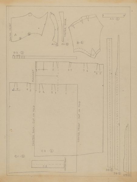 Editor: This is "Pattern for Man's Suit," a pencil drawing on paper created around 1938 by Henry De Wolfe. It features geometric shapes and lines. The composition almost appears fragmented, a deconstruction of what could become a tailored garment. What strikes you when you observe the arrangement of these shapes? Curator: Immediately, the precision of line is apparent. Note how each segment, numbered and meticulously rendered, displays an internal logic, an independent geometry. It’s a field of relations –shape to shape – line dictating form, but seemingly liberated from immediate functionality. De Wolfe presents us not with a suit, but with the *idea* of a suit, abstracted and intellectualized. Do you perceive a hierarchy within these forms? Editor: I see how the larger pieces might imply the body of the suit, whereas the smaller shapes could delineate pockets, buttons, or embellishments. Does the presence of the hand-drawn numerals and annotations enhance the piece’s artistic value, or are they merely functional? Curator: Consider that very dichotomy. The intrusion of text, the systematized labeling, can be perceived as graphic interventions. Are they separate from the art? I’d argue against this. These numerical markings become crucial to the formal unity of the piece – lending it a conceptual depth beyond mere representation. Editor: That’s an insightful interpretation; I hadn’t considered how even functional elements could reinforce the visual architecture of a work like this. It reframes the artistic essence away from representation and towards the articulation of its underlying structure. Curator: Precisely. What appears merely utilitarian becomes the very fabric of artistic expression.