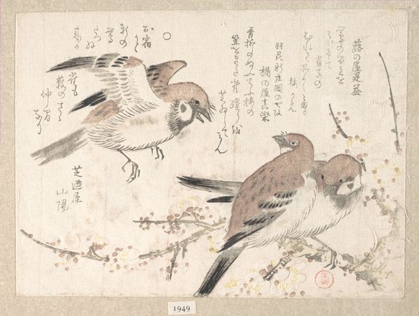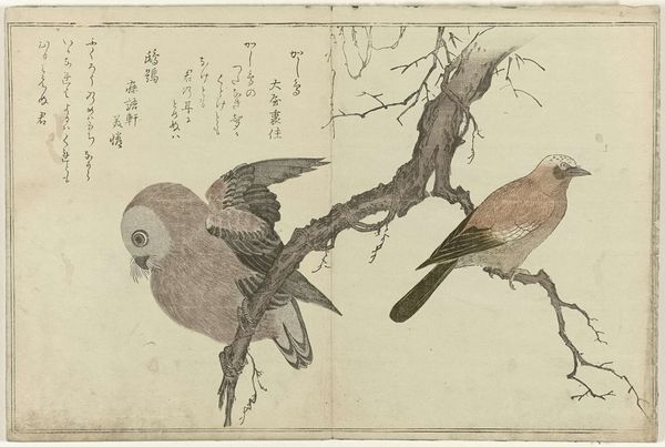 Curator: This is a page from the illustrated book "KachÅ gaden" by Katsushika Taito II. What a striking composition. Editor: It's beautiful, but there's a melancholy to it. The birds seem isolated, almost wary. Is that a societal commentary, perhaps? Curator: Perhaps. The choice of birds, the Jays, could symbolize vigilance, warning. And the script around them, surely poetry, might hint at deeper meanings. Editor: Yes, it’s more than just a pretty picture. The arrangement of the elements, even the empty space, contributes to this feeling of unease. It’s suggestive of the social hierarchy of the time. Curator: I find it remarkable how the artist captures the essence of these birds with such economy of line. The symbolism certainly resonates. Editor: Indeed. It is a quiet, compelling piece reflecting human interaction with the natural world and its inherent complexities.