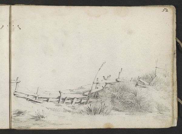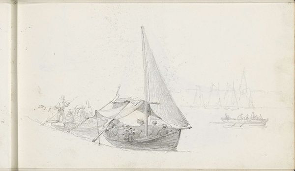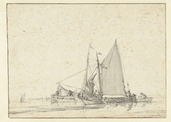 Pieter Moninckx made this river view with boats at anchor near a fishing spot using graphite on paper. The visible texture of the paper enhances the drawing's immediacy, inviting us to consider Moninckx's process. Look closely, and you can almost see his hand moving across the page, capturing the reflections on the water and the intricate details of the boats and fishing structures. Graphite, a relatively common material, allows for a wide range of tonal values, from the light, airy sky to the darker, more defined shapes of the boats. This choice reflects the growing availability of paper and graphite as tools for artistic expression. The drawing speaks to a society deeply connected to its waterways, where fishing and boating were essential parts of daily life. Moninckx elevates this scene through his artistic skill. By paying close attention to the materials and the making, we gain a deeper appreciation for the work, blurring the lines between everyday life and fine art.