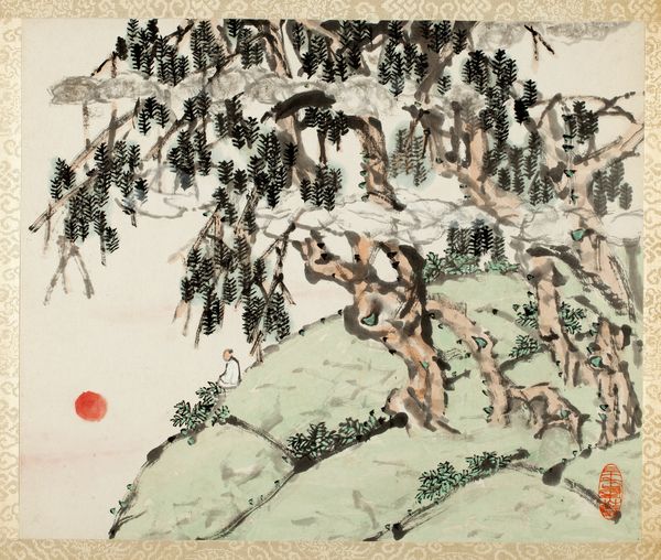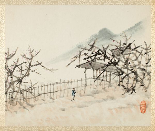 Curator: Here, we have Xugu's "Landscapes for Liu Songfu." This piece, whose exact date is still debated but likely falls between 1644 and 1911, employs ink and watercolours on paper. It offers a scene with a figure contemplating a wintry copse. Editor: There's a distinct melancholic mood, I think, wouldn't you say? It feels solitary, like the world is holding its breath. The figure is small against the backdrop of these looming, bare trees. Curator: The seeming simplicity is deceptive, really. Chinese landscape painting is loaded with symbolism, acting as a metaphor for personal and societal harmony, or, conversely, disquiet. It’s interesting to consider what turmoil the patron, Liu Songfu, might have been experiencing. Editor: Given the possible timeframe, which spans periods of immense upheaval in China, one might argue the landscape mirrors a personal or collective sense of displacement. The choice of desolate imagery evokes a certain precarity. Is this a personal statement or something more? Curator: It's always a dance between individual expression and adherence to artistic convention. Xugu was working within a tradition that highly valued subtlety and implication. The act of dedicating this, then, takes on social meaning as well as spiritual consideration. Editor: And what does that dedication tell us? About the artist, patron, their relationship? Landscape painting of the era can provide nuanced political commentary while appearing innocuous to outsiders, circumventing direct censorship. Curator: Precisely. The layering of ink washes to create depth, the precise brushstrokes that define each branch - these choices weren't arbitrary. They reflect an understanding of the aesthetic expectations of his peers but could also be pushing at the boundaries of what was permissible, too. Editor: Looking closely at the figure, that's another entry point. Their clothing, their posture—the artist utilizes specific details to situate him culturally and, perhaps, philosophically, inviting the viewer to speculate. This tiny human existing within these brushstrokes creates a fascinating dialectic. Curator: The art serves as both an observation of society and a place for reflection. Editor: I see it now - an incredible confluence of medium and social discourse captured across a paper surface. Curator: A view to ruminate over long after viewing it.