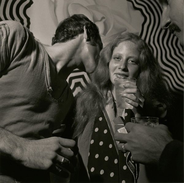 Editor: This is Larry Fink’s photo, Dance, American Legion, Bangor. The high contrast and close crop create such an intimate yet grainy portrait. How do you read the symbolism of this seemingly everyday scene? Curator: Note the material realities: the working-class dance hall, the cheap clothing, the close physical proximity. Fink's social documentary style implicates the viewer. Where do we situate ourselves in relation to this scene of leisure and labor? Editor: That's interesting. I was focused on the emotional connection between the dancers, but I see how Fink's choices highlight their social context. Curator: Exactly. By focusing on the textures and the environment, Fink elevates the mundane, prompting us to consider the socio-economic implications inherent in leisure and social dance. Editor: I hadn't thought about it that way. It changes my understanding of the work. Curator: Considering the means of production changes how we perceive the final product.