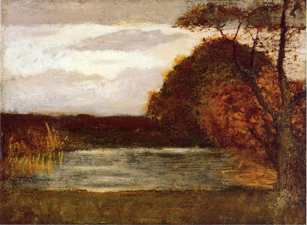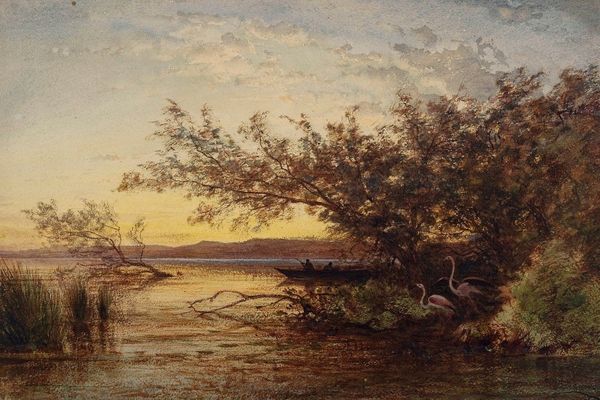 Editor: This is "Sunset on the Arno" by Giovanni Costa, or Nino Costa. It’s an oil painting, and the brushstrokes definitely give it an Impressionistic feel. I'm immediately struck by how warm and nostalgic it feels; the colors just seem to glow. What do you see in this piece? Curator: Beyond the visual warmth, consider what the sunset, and the river, might signify. The Arno, flowing through Florence, carries a historical weight. Sunsets, universally, symbolize endings, transitions. Together, they might represent the fading of a particular era or perhaps even a lament for a lost Florence, viewed through a golden, romanticized lens. What cultural memory might the river evoke for an Italian viewer? Editor: That's fascinating. I hadn't thought about the Arno itself as a symbol. Maybe it speaks to the changing face of the city and landscape? Is that something Costa explored more in his work? Curator: Precisely. Costa and other artists were part of a movement seeking a truer representation of the landscape – a push against academic rigidity. Their plein-air approach—painting outdoors—sought to capture fleeting moments of light and atmosphere, what we could consider an honesty of place. What emotional truth do you feel is captured through this Luminist technique, which really plays up the light here? Editor: The light really makes it. There’s this dreamlike quality to the whole scene, like looking at a memory. But, thinking about the historical context, it adds another layer of meaning to those warm colors, almost bittersweet. Curator: The enduring appeal lies, perhaps, in how Costa intertwined personal experience with collective memory, shaping the river and the setting sun into potent, resonating symbols. It encourages a deep personal meditation on time and transformation. Editor: That's a perspective I hadn't considered, thinking about both the personal and collective memories woven into this scene. Thanks for sharing.
