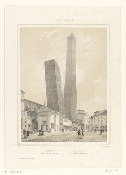 Curator: Here we have a photographic print, “View of the Asinelli and Garisenda Towers in Bologna, Italy.” The collective behind this image is known as Fotografia dell’Emilia and it likely dates somewhere between 1865 and 1907. Editor: It strikes me immediately as somewhat unsettling. That leaning tower on the left appears as though it's about to topple. It creates a disquieting tension within an otherwise calm cityscape. Curator: It is intriguing. Bologna was a popular destination for wealthy travelers in the 19th century, eager to see its medieval towers. And photography like this one served as documentation for those experiences, fitting into the era's fascination with realism. Think of the popular Grand Tour at this time! Editor: It also makes you wonder about the photographer's intentions. Why choose this angle that emphasizes the precariousness? Was it simply documentary, or were they trying to capture a particular feeling about the city? The towers weren't necessarily considered dangerous back then. And what was the labor like? How long would exposures have been? Were the people even aware that they were part of this? Curator: That’s an interesting question to explore when discussing the photographic medium at that time. Of course, we can't know the exact intention but the circulation of such imagery helped create, or reinforce, the city’s image as an historic place worth seeing and experiencing, playing a role in shaping Bologna's cultural identity. The rise of tourism would naturally put this work in context. Editor: Yes, but let’s not forget the practicalities! How does the specific material—the photographic print itself—affect our perception? The sepia tones, the texture of the paper…it all contributes to this sense of a distant, almost dreamlike past, while relying on recent innovations. The convergence of science, technology, tourism and the "real". Curator: Absolutely, and perhaps we're also projecting our modern understanding of "leaning towers" and structural instability onto it. Maybe people viewed the Garisenda tower with less anxiety at the time. Editor: Still, the choice of subject, the composition… It all leads me to suspect a deliberate effort to evoke a certain mood. Curator: In any case, it’s a beautiful and evocative piece. Editor: Indeed. One that bridges history, artistry, and the enduring allure of material culture.