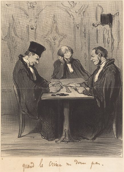Curator: Honoré Daumier's lithograph, "Parisians who will never be placed under surveillance of the secret police, plate 12 from Tout Ce Qu'on Voudra", created in 1847. It is now housed here at the Art Institute of Chicago. Editor: The name feels like pointed irony. There's a real stillness here, but also tension, especially in the man resting his head on his hand. I imagine these gentlemen believe their quiet game renders them invisible. Curator: Precisely. Daumier excelled at using the mundane aspects of Parisian life to make incisive political commentary. Underneath King Louis Philippe's reign, there was censorship and widespread surveillance. Daumier spent time in prison for similar works! Editor: So, the game itself might function as a symbol. Do you think this game is checkers, with its light and dark pieces, to represent the all-seeing "secret police" that loom over them? Curator: That is an astute reading. By showing seemingly innocuous, bourgeois gentlemen engrossed in checkers, Daumier suggests who truly held power. He plays on that very anxiety through visual puns of the ever-watchful eye. He uses a symbol, a familiar, comfortable scene, against itself. Editor: The "all seeing eye", and their naiveté towards it—a symbol for both state power and the bourgeoisie denial of it. Curator: Precisely. Notice the subtle realism in Daumier's rendering— the slight untidiness of the room, their clothes and slumped figures. These everyday details serve to further the socio-political critique, grounding it in relatable human terms. Editor: It's a poignant reminder that power operates often in ways we might easily overlook or consider inconsequential, while at the same time this fear of secret surveillance has always been current. A fascinating capture, from that era, with a sense of timelessness that is still present. Curator: A potent work that is both a product of its time and endlessly relevant. I invite visitors to linger and see just what this satirical scene sparks within them.