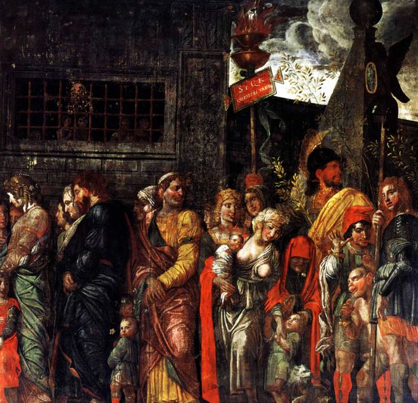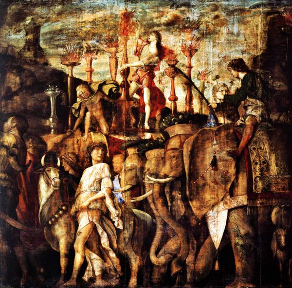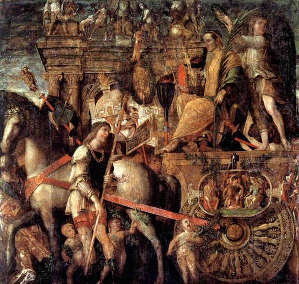 Andrea Mantegna painted this scene depicting 'Holders of currencies and gold jewelry, trophies royal armor'. At first glance, one is struck by the display of opulence, a parade of the spoils of war. Royal armor, gold jewelry, and currencies are carried as trophies through a classical setting. Triumphal arches and columns loom in the background. These motifs of victory and wealth are reminiscent of ancient Roman triumphs, echoing scenes of emperors returning from conquest. The image evokes a sense of power and dominance but also elicits a consideration of the human cost of war. Notice how Mantegna's art taps into our collective memory of such processions. We recall similar displays in the art of ancient civilizations, such as Egypt or Persia, or even pre-Columbian America. The weight of these images engages our subconscious on a profound level. The cyclical nature of history comes to mind, where triumphs are followed by defeats, empires rise and fall, and symbols of power are constantly reinterpreted across time.