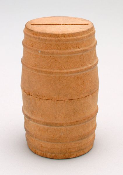 This delightful, small barrel bank was made by an anonymous maker out of earthenware. It's a humble object, but one that speaks volumes about the culture of saving. The hand-thrown ceramic is a warm, reddish-orange, with visible throwing lines, which speaks to the direct, unfiltered way it was shaped. It is like the potter has made an everyday object, rather than a high art sculpture. The form is simple: a squat cylinder with a coin slot on top. The reference to a barrel may evoke associations with storing up wealth. Making this bank would have involved mixing and preparing the clay, shaping it on a wheel, slowly drying it, and firing it in a kiln. All steps requiring patience and skill. The result is an object that transcends its humble function, inviting us to consider the value we place on both money and the work that goes into making even the simplest things.