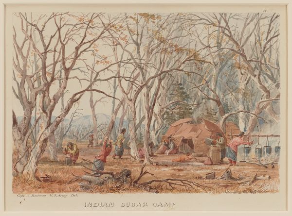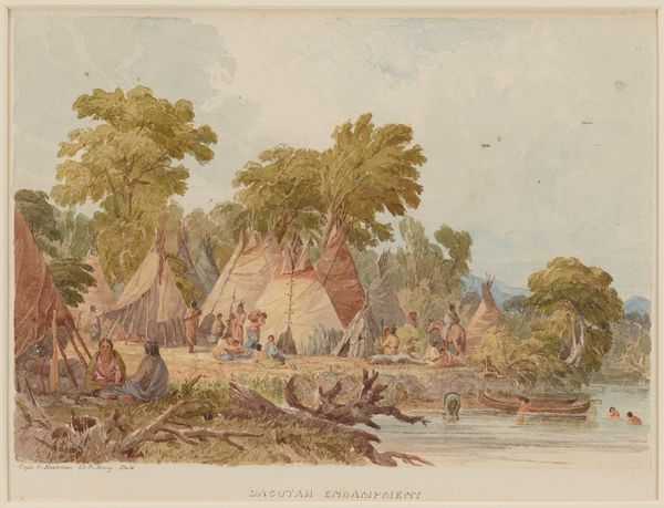 Seth Eastman, a West Point graduate and military officer, made this watercolor called ‘Dacotah Village.’ Eastman's career involved mapping and depicting the American West, often romanticizing or idealizing Indigenous life while serving expansionist policies. In this village scene, we see the everyday life of the Dakota people, rendered with a detached, ethnographic gaze. Though seemingly objective, the artwork is steeped in the complex politics of representation. Consider the power dynamics inherent in Eastman, a government employee, documenting a culture being actively displaced. The subtle tones and seemingly peaceful scene mask the violence of settler colonialism. How do we reconcile the aesthetic appeal of this image with its historical context? Does the act of observing and documenting inherently alter the thing being observed? This artwork invites us to reflect on the fraught relationship between representation, power, and the erasure of Indigenous histories.