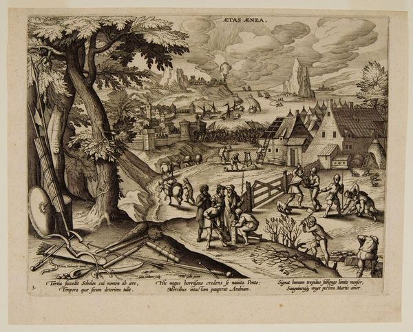 Curator: Antonio Tempesta's engraving, "June: Sheep Shearing," now residing in the Harvard Art Museums, feels like stepping into a dream of pastoral life. Editor: It's a busy dream, though! All those tiny figures, each caught in a different task, create this overwhelming sense of productive chaos. It’s almost dizzying, isn’t it? Curator: I find it compelling. The way Tempesta crams so much activity into the scene reflects the bustling energy of harvest season. It's like a miniature society unfolding before us. Editor: Yes, the social aspect is key! This isn't just about pretty landscapes; it's about labor, community, and the rhythms of agricultural life, idealized though they may be. Curator: Idealized, perhaps, but also deeply felt. Look at the tenderness in the way the sheep are handled. The engraver's burin captured a real connection to the land. Editor: Perhaps, but let's not forget that "connection" is often a romanticized notion, obscuring the realities of hard labor and social hierarchies. It makes me wonder how such images shaped ideas about rural life for urban audiences. Curator: Well, regardless, it's a beautiful reflection on the season's bounty and the beauty found in collective effort. Editor: Indeed. It invites us to consider our relationship with the natural world and the communities that shape our existence.