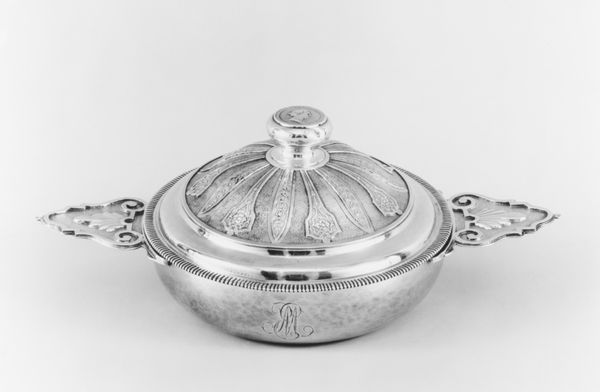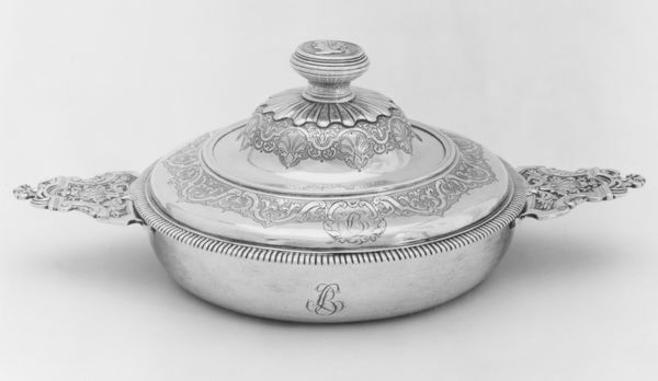 Curator: Here we have an exquisitely crafted piece, a silver bowl with a cover, referred to as an ‘Écuelle,’ dating back to the early 18th century, between 1700 and 1725. It's attributed to Nicolas II Fauveau the Elder, and you can find it at the Metropolitan Museum of Art. Editor: The stark silver really jumps out. It feels so cool, restrained. The hammered texture of the bowl is lovely. It hints at handcraftsmanship, which, given the likely context, seems… interesting. Curator: Exactly. These écuelles were not mere utilitarian objects, but potent symbols of status and social power, particularly within aristocratic dining culture of the Baroque era. Imagine the political and social dynamics that would play out over a shared bowl. Editor: Definitely, objects like this can't be divorced from their political landscape. Considering the period, it embodies the height of royal extravagance and privilege. The ornamentation, even as subtle as it is, reflects the social hierarchies of the time. This bowl, intended for something as fundamental as food, becomes a tool to visualize how much better someone's life must have been based on class. Curator: Precisely. Think of the access this piece granted – access to power, to the court, to the elite. Even the act of sharing food from it signified inclusion, belonging to a very select circle. Furthermore, it visualizes, in silver, labor exploitation and vast economic disparity. Editor: The handles offer a glimpse of the Baroque style. Did the silver's reflective surface further highlight that power, literally mirroring the elite back at themselves? Curator: Undoubtedly. Silver, in its gleam, speaks of wealth, sophistication, and access, so its reflective properties reinforced the visual rhetoric of power. Its value was, and still is, symbolic. Editor: Seeing something so intimately linked to displays of status encourages a deeper exploration of the politics embedded within decorative art. It reminds us that even the most beautiful object can have loaded meanings, especially surrounding issues like consumption, labor, and class. Curator: I agree. This ‘Écuelle’ encourages us to consider what seemingly decorative art truly communicates.