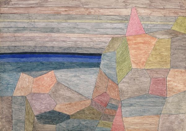 Curator: Soothing. That's the first word that pops into my head. It's like looking at a carefully organized garden after a gentle rain. Editor: That's a beautiful image! You are gazing at Paul Klee's "View into the Fertile Country" from 1932, which resides here at the Städel Museum. Klee rendered this using watercolor, oil pastel, and ink on paper. It presents a fascinating convergence of abstraction and landscape. Curator: The lines draw me in—those soft, horizontal strata… and the geometric shapes. It’s both planned and somehow dreamlike. Did he have something specific in mind? Editor: It's believed Klee's landscapes from this period reflect his yearning for an escape, especially given the rise of fascism in Europe. We might even interpret these geometric forms not just as abstract, but as symbolizing social structures. Notice the varying densities within the artwork's color fields and structural blocks and how they affect our reading of its subjectivities. Curator: Interesting. I was going to say they feel like architectural ruins almost. The slightly faded palette emphasizes that feeling for me too. Like, nature reclaiming what humans constructed, something like that? It is a kind of emotional space I get while visiting sites. Editor: Absolutely, this intersectional reading emphasizes ideas around land, ownership, memory and erasure. It might be productive to analyze its aesthetic program in parallel with Klee's other works to see what broader meanings surface within his art practices. The individual rectangles of color reminds one of building blocks in the context of societal building, right? Curator: Totally. Though I do love that Klee uses, ostensibly, the rigid structure of blocks to generate that feeling of, as I mentioned, an oneiric state or space. Editor: Indeed, such use demonstrates the tension between our desires for control and those innate tendencies towards release. As we conclude, it becomes even more evident that this painting offers a landscape which reflects Klee's deeply personal journey. Curator: A landscape that makes me ponder mine as well, the ways in which structure and looseness interact, informing the view and how I move across that space. Thanks!