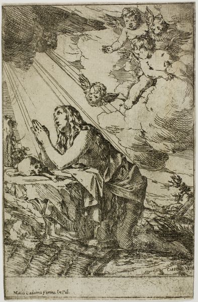 This engraving of Christ carrying the cross, attended by Veronica and watched over by weeping angels, was created by Johannes Wierix sometime between 1550 and 1620. Wierix worked in Antwerp, at a time when the Catholic Church was attempting to reassert its authority in the region. The image is rich in visual codes that would have been well understood by contemporary viewers. Veronica's veil bearing the image of Christ's face was an important relic, a symbol of the miraculous power of the church. The weeping angels, too, are a reminder of the emotional power of the Passion story in Counter-Reformation Europe. Wierix worked as an engraver for the Plantin-Moretus printing house, so this print would likely have been reproduced and distributed widely. Understanding the social and institutional history of such an image requires that we look at the way religious imagery was consumed, controlled, and debated in this period. Researching publishing history and religious movements, we can better understand this image's significance.