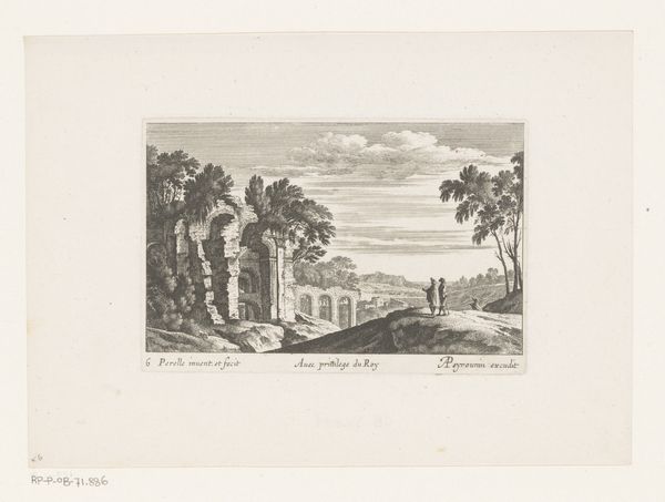 This etching presents a classical ruin set within a river landscape. The ruin, likely Roman, evokes the glory and decay of past empires, a common theme throughout European history. The image’s power lies in its depiction of time and memory. We see the ruins of an ancient structure, which stands as a reminder of past grandeur, juxtaposed with the constancy of nature. The water, symbolizing fluidity and change, erodes the stones, mirroring how time washes over human achievements. This is a motif that reappears throughout art history – the transience of human endeavor against the eternal backdrop of nature. Consider the Romantic painters who, centuries later, also used ruins to symbolize the futility of human ambition. This ruin is not just a physical structure; it's a psychological one, tapping into our collective awareness of mortality and impermanence, stirring deep emotional responses. The motif reappears time and again, each time evolving in meaning, yet always connected to that fundamental human awareness of time's passage.