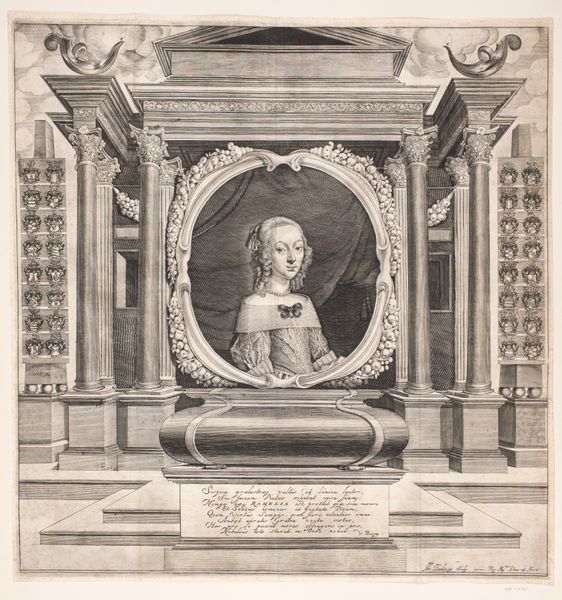 Curator: Let's talk about this engraved print from between 1650 and 1653, held at the SMK - Statens Museum for Kunst. It’s called "Ingeborg Ulfstand. Mindeblad" and the artist is, alas, anonymous. What’s your first impression? Editor: Somber, formal… and intensely detailed. The framing around the portrait feels almost architectural, doesn't it? All those heraldic symbols pack a serious visual punch. What can you tell me about its production? Curator: Well, being an engraving, it involves a subtractive process. The artist would have used a burin to cut lines into a metal plate, which was then inked and pressed onto paper. This would allow for the reproduction and distribution of her image on a greater scale. And each of those heraldic crests – do you find that interesting? Editor: Massively! Those crests create a potent iconography. They speak of lineage, power, and social status. Ingeborg Ulfstand is literally framed by the symbolic weight of her family connections and those she married into, aren’t they? Look at the Glober and Ronnow crests – very intricate and heraldic imagery. Curator: Precisely! These aren't just decorative flourishes. They provide a historical context, rooting her within a specific network of power, land ownership, and familial alliances. The care put into the materials and method speak to a desire to record history with care. Editor: And yet, paradoxically, that very precision creates an emotional distance. The crisp lines, the formal pose, the dense symbolism – it feels more like a carefully constructed representation than an intimate portrait. I find the inscriptions intriguing though; they seem very specific to Ulfstand. Curator: They really make this more than a simple memorial, I think! Consider that it served not only as a commemoration of Ingeborg Ulfstand but also as a visual testament to the family’s status. Editor: So, on the one hand, a reproducible image that democratized access, in a sense, but on the other, reinforcing a very particular hierarchical narrative through all these family crests? Curator: Exactly! Production and social function, inextricably linked. Well, this certainly underscores how techniques and symbols worked together to tell a story of status and memory. Editor: A fascinating convergence of visual storytelling and the social fabric of the time, indeed. I hadn’t really considered the labor behind engraving in light of its memorial aspect before.