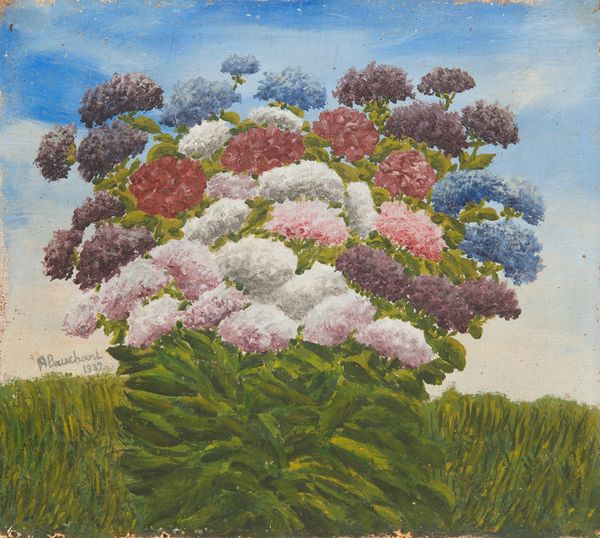 Editor: So, here we have Adolf Dietrich's "Margeritenstrauss mit Kanarienvogel," painted in 1954, using watercolors. It’s such a wonderfully detailed still life. All those daisies! What stands out to me is the contrast between the almost photographic realism of the daisies and the very simplified, almost naive background. What's your interpretation of that juxtaposition? Curator: The key is situating Dietrich within his historical context. He was celebrated as a ‘naïve’ or ‘outsider’ artist, a term loaded with art-world assumptions about who gets to make ‘real’ art and how it should look. Consider how the institutional art world of the mid-20th century, particularly in Europe, was wrestling with notions of high and low culture. By labeling Dietrich “naive,” were they elevating or marginalizing him? Editor: That's a good point. It’s like they’re simultaneously celebrating his unique vision while distancing him from "serious" artistic movements. But where do you think the flowers come in? Curator: The daisies themselves could be read as symbols of purity and innocence. Placing them with the canary—itself often a symbol of domesticity—within a simplified landscape offers a controlled vision of nature. Ask yourself, how does the careful arrangement of elements here relate to a broader social desire for order and simplicity in the post-war period? Was this simplicity real, or an idealized projection? Editor: It seems so straightforward at first glance, but it is more complex once you dig a little bit into it. Thank you. Curator: The point is to look beyond face value. It makes you think about not just the aesthetic, but the whole socio-political construction of art itself. It always comes back to who decides what’s worth looking at, doesn’t it?