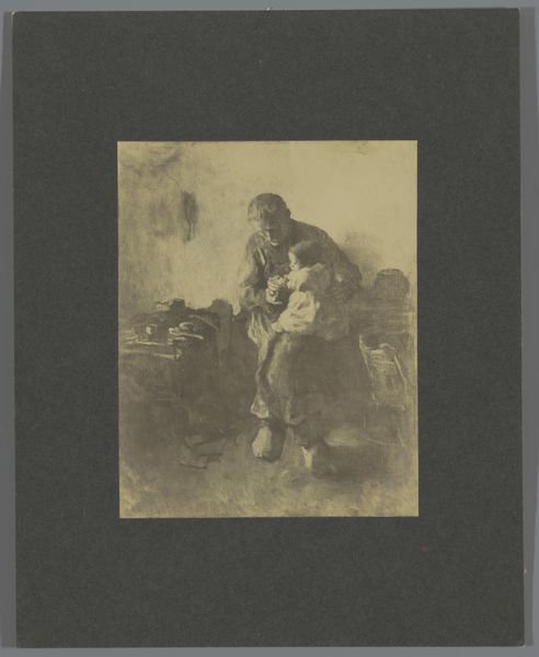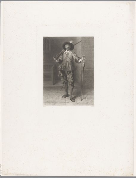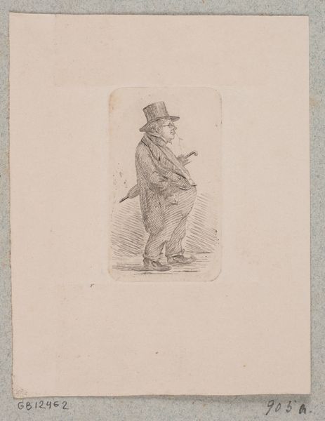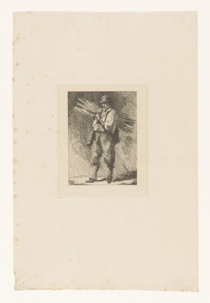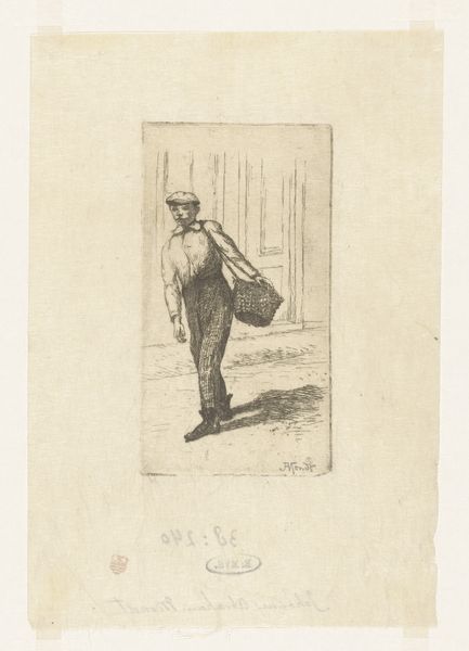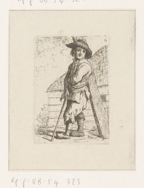 Curator: Here we have Caspar Jacobsz. Philips's "Zwerver bij een kruiwagen," a pencil drawing from 1767. It resides here at the Rijksmuseum. Editor: It’s somber, isn’t it? There’s a palpable sense of weariness radiating from this figure. His slouch, the muted colors… it speaks of a difficult existence. Curator: Absolutely. Consider the broader social context. Philips created this piece during a period of economic hardship for many. Images like this offered a glimpse into the lives of those struggling on the margins of Dutch society. The “Zwerver,” the wanderer, becomes a symbol, a witness to that struggle. Editor: That hunched posture… to me, the downcast eyes say even more. It echoes images of the Prodigal Son in a strange way – a humbling. Do you think the wheelbarrow itself might act as some symbol of labor or perhaps of burdens carried? Curator: Undoubtedly. Wheelbarrows, like plows and other tools, often appear as emblems of toil in genre paintings. The iconography connects the figure directly to the world of manual labor, a world often romanticized but undoubtedly challenging. Philips seems to acknowledge the labor’s human cost. The sketch is Rococo. It focuses on light and shade to amplify an idealized theme. Editor: Yet it's more intimate, more human than simply celebratory. You can practically feel the texture of his worn clothing, the weight of that unseen load in the wheelbarrow. Curator: Precisely. This drawing participates in the then-contemporary vogue for genre scenes. The rise of a middle-class art market fueled interest in depictions of everyday life. Artists responded by portraying both idealized visions and sympathetic representations of those often overlooked. Editor: And what about the use of pencil and watercolour together? What does this particular selection of materials contribute to our viewing? Curator: The subtlety and softness achieved by the pencil sketch, enhanced by watercolor, adds a gentleness to the character, highlighting how poverty can steal strength and joy from a person. Editor: That blend makes a statement. It lends humanity, wouldn’t you say? It rescues him from being simply an icon of suffering. Curator: Well put. The work underscores the importance of visual art not just for aesthetic pleasure, but also as a window into the human condition across time. Editor: I see it now, the image makes me think deeply about those who toil and go largely unnoticed and reflects on our own responses toward such difficult truths.