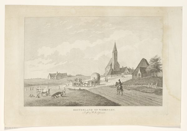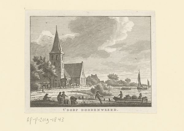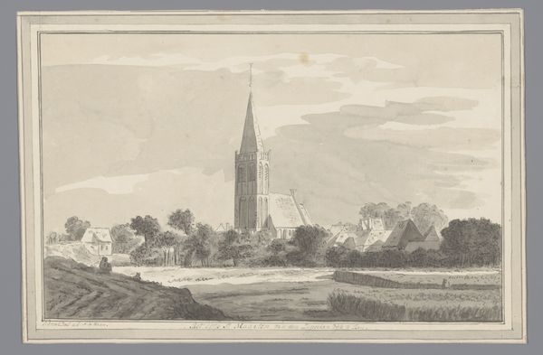 Editor: This is *Gezicht op de Sijbekarspel*, a pencil, watercolor, and print work by J. Drost from 1771. It feels very serene and quiet, almost melancholic in a way. What cultural narratives might this peaceful depiction of a Dutch landscape be conveying? Curator: It's interesting you pick up on the melancholy. Watercolors, particularly in landscapes, often speak to a yearning for a simpler time, a connection to nature often idealized. Churches are potent symbols, of course. They visually anchor the community and connect to a spiritual yearning. Do you notice how the church spire pierces the sky? Editor: Yes, it draws the eye upward. So, the church isn’t just a building; it's a link between the earthly and the divine? Curator: Precisely. And consider the lone figures near the church. Are they a family? Are they seeking guidance, solace, perhaps reaffirming their connection to the community and its shared beliefs? Editor: That makes me think about how important community identity was back then, centered around the church. It's much more fragmented today. Curator: Exactly. This landscape isn't just about aesthetics; it's a visual representation of societal values, faith, and perhaps even a longing for stability during a period of change. Editor: I never thought about a simple landscape holding so many layers of meaning. Curator: That's the power of symbols, isn’t it? They connect us to our past and offer a glimpse into the cultural memory of a time.