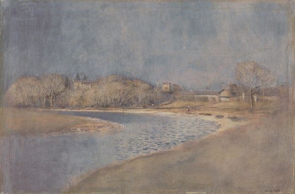 Curator: Victor Pasmore’s, The Hanging Gardens of Hammersmith, No. 1, presents us with a dreamlike vista, rendered with delicate precision. What strikes you first about it? Editor: It evokes a sense of quietude, almost melancholy. The muted palette and bare branches suggest a moment of reflection, perhaps on urban nature or its absence. Curator: Indeed. Pasmore often explored the convergence of nature and the industrial landscape, and this piece, now in the Tate collection, captures that liminal space. The subtle use of color seems almost symbolic. Editor: Perhaps representing the fragility of our connection to the natural world amidst urban sprawl? These gardens become a metaphor for a lost Eden, hinting at environmental concerns and social inequalities in accessing green spaces. Curator: A powerful interpretation. The recurring imagery of gardens represents a yearning for harmony, a visual echo of a more balanced world. Editor: Thank you. It's left me thinking about the potential for art to ignite critical conversations on social justice and ecological sustainability. Curator: And for me, a reminder of the symbolic power of gardens, places of reflection and enduring hope.