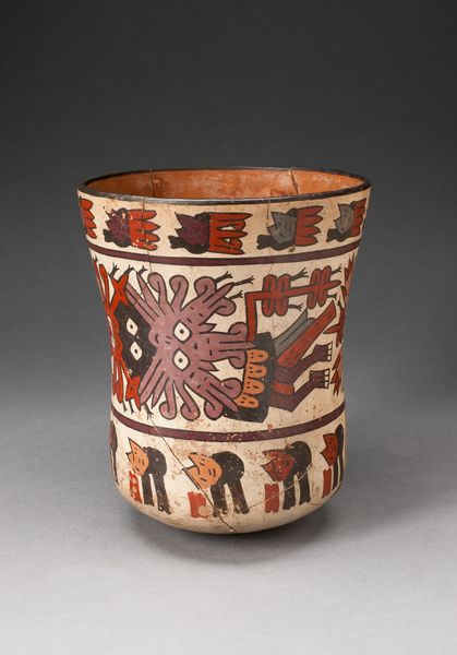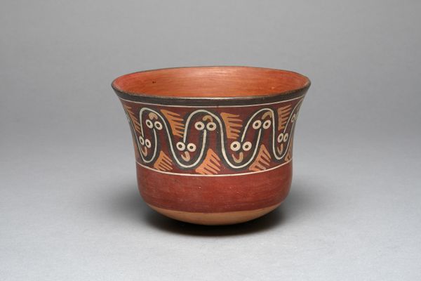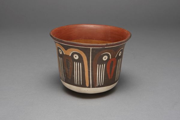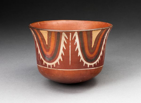 Editor: So, here we have an earthenware bowl created by the Nazca people sometime between 180 and 500 AD. It's decorated with an abstract figure and dart-like shapes. It feels incredibly ancient and almost otherworldly to me. What jumps out at you when you see this piece? Curator: What jumps out? That’s the perfect way to phrase it. It practically leaps from the clay, doesn’t it? This bowl whispers of stories untold, of rituals and beliefs of a people who saw the world in a vastly different light. To me, the darts aren't merely decorations; they could be symbolic projectiles, perhaps representing offerings, or even prayers sent skyward. Does the central figure appear intimidating, benevolent, or something else entirely to you? Editor: Intimidating is a good word... I hadn't really considered the darts as having such a purpose! The figure has a stern, almost stoic face. The design feels really sophisticated despite the limited colors. How did they achieve that? Curator: Precisely! Sophistication dances with simplicity, a beautiful duality, no? The Nazca people were masters of their medium. They extracted pigments from minerals and plants, achieving a remarkable range of hues. But more than just the materials, consider the steady hand, the sure vision needed to create such intricate, symmetrical designs freehand. Think of the potters, hunched over their clay, their breath the only sound as they painted… imagine the centuries of accumulated knowledge flowing through them. Editor: It’s incredible to think about. It gives you a real sense of connection to the past. Curator: Absolutely. These objects are never just objects; they are conduits. They conduct stories, beliefs, entire worlds into our present. Seeing them allows us glimpses, hints, into the infinite possibilities of human experience. What I see in this bowl is the essence of Nazca: ingenuity, artistry, and a deep spiritual connection to the world around them. What will you do with that glimpse?