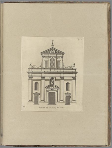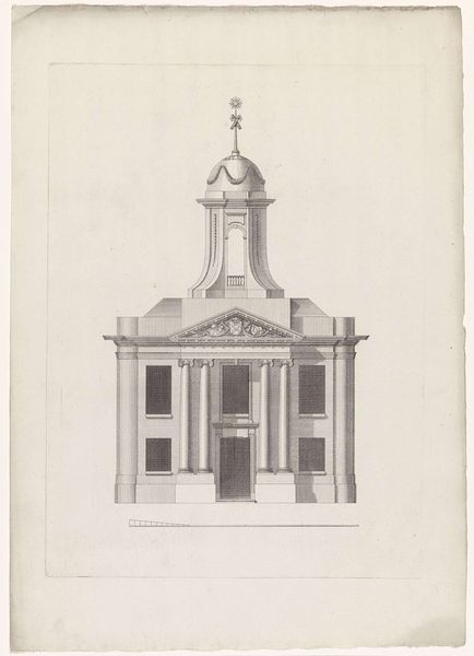 Editor: This is "Ontwerp voor de Oostkerk in Middelburg," a 1652 etching by Daniel de Blieck. The intricate linework creates a very formal, almost sterile, architectural elevation. It's quite captivating, yet it feels so removed from a lived-in space. What do you see in this piece beyond just the building's design? Curator: It's important to recognize that this image participates in the shaping of civic identity. Etchings like these weren't merely technical drawings; they were instruments of power, influencing public perception. The imposing scale and baroque details, though finely rendered, communicate the authority and wealth of the patrons and the city itself. Editor: So, this wasn’t just about illustrating how the building would look. It had a political purpose? Curator: Precisely! Think about the intended audience. These images circulated among elites, solidifying their cultural capital and reinforcing their vision of Middelburg as a prosperous, divinely sanctioned space. The building itself would then embody these values for the public, reinforcing social hierarchies through architecture. Do you think its imposing presence contributed to social control? Editor: Definitely, seeing the design detached from reality and more as a statement of intent provides so much additional depth. I hadn’t thought about how the visual language itself contributes to that sense of authority. Curator: The “cityscape” theme underscores the intent to monumentalize urban space through architectural statements. Now, considering its context, this church likely served a specific community or sect within Middelburg, further embedding social meaning in this rendering. The “geometric” visual object serves a purpose, too; this is the Age of Reason taking shape, using precision and line. Editor: That's a powerful idea, the Age of Reason captured in a sketch. I see it so differently now, it makes it seem less sterile. Thanks! Curator: And that’s the value of seeing art in context – it opens up layers of meaning that enrich our understanding.