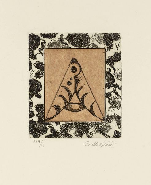 Editor: This is Gertrude Hermes' print, "The Yolk." I'm struck by the stark contrasts and geometric shapes—it feels like a deconstructed figure within this circular form. How do you interpret this work? Curator: The yolk, often a symbol of potential and origin, is here fragmented, almost violently so. Hermes, through the sharp lines and contained explosion of shapes, seems to be exploring the psychological tension between creation and destruction, isn't it? Editor: That's interesting. I hadn't thought about the destructive element. Curator: Consider the period it was created in. Did Hermes perhaps channel the anxieties of a pre-war world, representing a fracturing of established order? Editor: I see what you mean! It gives a whole new level of meaning. Curator: Symbols are never fixed. This print offers us a space for introspection about what new forms can emerge from chaos. Editor: I'll definitely look at Hermes' work differently now. Thanks!