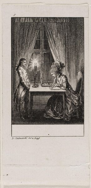 Curator: The artwork we are looking at is titled "The Occupations of Women: Playing Games," created by Daniel Nikolaus Chodowiecki. Editor: It's striking how the candlelight creates such a contained, almost secretive space for these women. Curator: Absolutely. Chodowiecki, born in 1726, was a master of etching, focusing on the material realities of daily life, and this piece really highlights the leisure activities available to women of a certain social class. Editor: But what does "occupation" mean here? Is it a gentle critique, acknowledging that these women's lives are circumscribed, their "occupations" limited by social expectations? Curator: It's a delicate balance. The intricate detail achieved through etching speaks to the labor involved in creating such an image, mirrored perhaps in the highly cultivated "occupation" of social gaming. Editor: So, a commentary on both the artist's labor and the social construction of womanhood... interesting. Curator: Indeed, it prompts us to consider whose labor is valued and whose is rendered invisible.