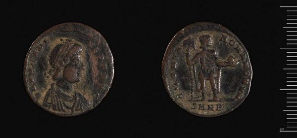 Curator: Here we have a copper coin from Constantinople, bearing the name of Arcadius, an emperor of the Eastern Roman Empire. It weighs just over 5 grams. Editor: My first thought? It feels incredibly weighty with history. You can almost feel the centuries in the weathered details. Curator: Indeed, the worn surfaces are part of its visual language. Consider the semiotic weight of the imperial portrait, set against the iconography on the reverse. Editor: I'm drawn to the figures on the other side—there's a kind of ghostly quality to the emperor figure holding a standard. It's like a fleeting moment captured in metal. Curator: Notice how the artist employs symmetry and balance to convey power and authority within such a small space. It's a masterful example of imperial messaging. Editor: It's amazing to think that such a tiny object once held so much value and represented so much power. Now, it's just a beautiful relic, whispering stories of a bygone era. Curator: Precisely. Its materiality invites us to contemplate the transient nature of power and empire. Editor: And reminds us that even the smallest object can hold the biggest stories.