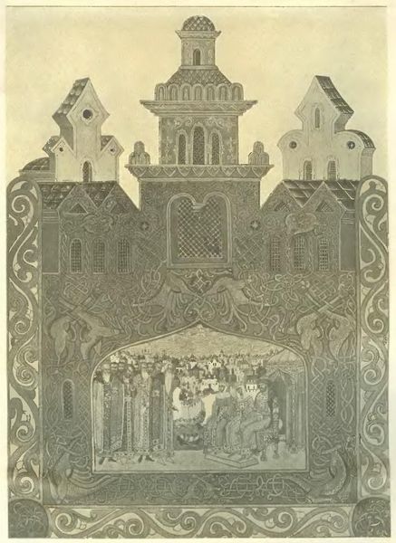 Curator: Nicholas Roerich painted "Arrival of Prince Michael Glanda Kambila to Russia, Veliky Novgorod" in 1913. It is a watercolor work that embodies the Russian Avant-Garde style. Editor: It gives the immediate impression of a highly ornamented stage set. The architecture looks less like buildings and more like carefully constructed props. Curator: And that speaks volumes about its production! Roerich was intensely involved in stage design, and we can consider that aesthetic, its associated workshop practices and construction methods, to see him employing the skills and sensibility of a craftsman in a work of supposedly "high art". The layering of details—look at the dense patterning—demands time, labor, careful design and meticulous application. Editor: Yes, but look at the symbolic layering. We have the stylized cityscape suggesting Novgorod, the arrival scene playing out as a moment of cultural exchange and, above it all, these fantastic beasts echoing both heraldry and the illuminated manuscript tradition. Curator: True, those details invite readings of history, tradition, and power. It still raises questions about the production value—is the high symbolic content elevating it, or the painstaking manual process grounding the piece? Editor: The iconography definitely ties it to Russian identity and heritage. This scene, and those beasts above, conjure the past in a potent, perhaps idealized, way. Curator: I can see how the images function as an embodiment of cultural values; yet the tangible reality is in the watercolors and the labor in its creation. This forces me to remember this work's making in relation to consumer culture as much as the symbolic culture. Editor: A point well-taken. All these elements – labor, heritage, design and execution – are so intensely merged. Curator: Yes, examining the process reveals the real art! Editor: But understanding the layered iconography reveals deeper resonance over time.