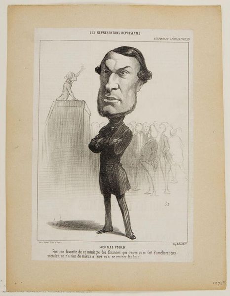 Curator: This is Honoré Daumier's lithograph from 1849, entitled "Achille Fould." Editor: He looks quite imposing! The stark contrasts of the lithograph lend an air of unflinching seriousness to his stance. He appears almost judgmental. Curator: Daumier produced this print as part of a series of portrait caricatures of French parliamentarians. Consider the materiality: lithography was a relatively inexpensive process that allowed for wide distribution in newspapers and journals. It became a powerful tool for social and political commentary. Editor: Yes, Achille Fould was a very powerful banker and politician, so Daumier emphasizes the iconic symbolism of power here: the stiff posture, the stern gaze, the dismissive air towards the speaker on the podium behind him. Look at the ghostlike audience seemingly supporting Fould by simply standing still behind him, with their vague presence being somewhat disturbing. Curator: Precisely. He exaggerates the features, ballooning the head and compressing the body to comment on Fould's perceived arrogance and self-importance. It's about skewering the establishment through mass-produced imagery. The image challenges notions of art as solely the domain of the elite. Lithography democratizes the portrait, turning it into a form of visual critique for the masses. Editor: And by placing him in what looks like an auditorium setting, he suggests that Fould's ego might be taking center stage more than the proceedings themselves. This work, though technically a portrait, functions as a symbolic commentary on the theater of politics and its power dynamics. It certainly triggers thoughts about celebrity status within politics. Curator: Absolutely, by looking closely at these satirical portrayals and the lithographic method itself, we begin to comprehend the artistic practices as intrinsic to political discourse in France at that time. Editor: A wonderful exploration into the visual symbols embedded within Daumier's criticism.