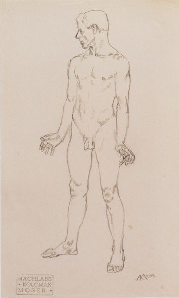 Józef Simmler sketched this nude male figure as a study for his painting "Martyrdom of St. Matthias." Observe the figure's dynamic pose; it is reminiscent of classical sculptures of antiquity. This stance, with its weight shifted and arms engaged, evokes a sense of action and purpose. It's a motif that recurs throughout art history, from the contrapposto of Greek statues to the Renaissance depictions of biblical heroes. The tension in the muscles and the turn of the body speak to an inner psychological state, perhaps one of defiance or struggle. The naked body is a symbol, stripped of social artifice. Consider how artists across time have used it to convey vulnerability or strength. It’s a motif that continues to provoke and engage us, tapping into deep-seated emotions and subconscious associations. The power of this image lies in its capacity to engage viewers on a visceral level, eliciting empathy and awe. The body becomes a canvas for expressing intense emotion, reflecting both human limitations and potential. Through this seemingly simple sketch, Simmler connects us to a long line of artists grappling with the human form and its enduring symbolic weight.