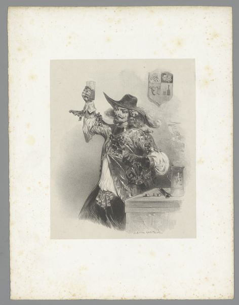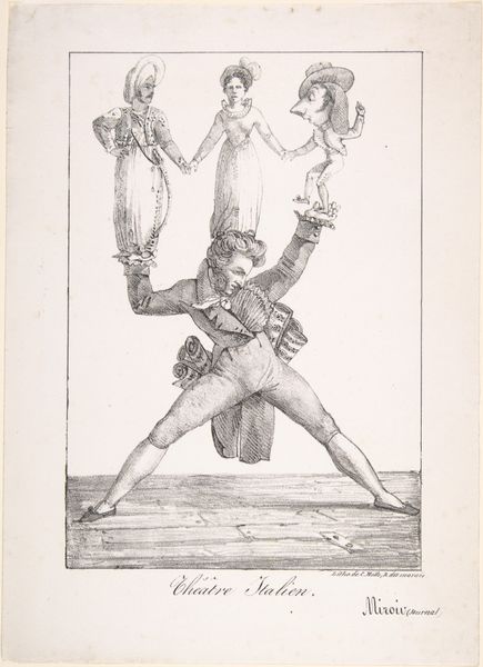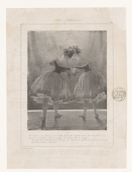 Curator: This pen and pencil drawing, dating from 1833, is titled "Paljas en Pierrot," made by Paul Gavarni. It is currently held at the Rijksmuseum. What is your first impression? Editor: It's... unsettling. The rendering is exquisite, a tight and complex balance of shadow and light. But the mood—the slumped figure weighed down by the other—it suggests a dark sort of camaraderie. Curator: I agree. Gavarni was particularly interested in exploring societal roles and identities through his caricatures. In this instance, the figures of Paljas, a Dutch clown, and Pierrot are representative of particular archetypes, often examined through the lens of Romanticism’s focus on human emotion and internal conflict. Editor: Tell me more about those figures, as material forms. Consider the line work, the way the artist meticulously renders the checkered fabric of Paljas' trousers and contrasts it with the smoother, simpler garb of Pierrot. It seems almost designed to highlight their differing social statuses and burdens. Curator: Absolutely. And their postures reinforce that. Pierrot, usually a symbol of wit and lightness, appears here almost childlike, being carried. This challenges the usual reading. I would argue this subversion encourages discussion about power dynamics, and perhaps the literal and figurative weight of expectation or even dependency. Editor: The weight of dependency… precisely. I see how Gavarni has used line and composition to draw our eye downwards, emphasizing the stooped posture and strained figure of Paljas. There’s a performative aspect here, as though both characters are trapped in roles dictated by social constraints. The composition, the technique… everything points toward imprisonment. Curator: It's a sharp social commentary. It’s especially intriguing when viewed through today's lens of social justice—forcing the observer to address their personal and political agency when dealing with hierarchical relationships. Editor: It prompts consideration for not just what is seen, but the underpinnings and the structural foundation on which is all precariously supported. The artist challenges us to critically look, even when looking at clowns, a powerful commentary for our times. Curator: Indeed. It demonstrates the ability of drawings such as this one to trigger conversations about identity, positionality, and power – across eras.