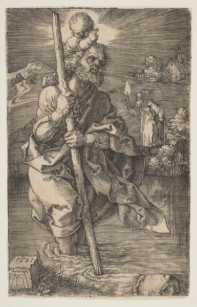 Curator: Here we have a piece titled Saint Christopher Facing Left, created sometime between 1485 and 1528 and attributed to Albrecht Durer. It's currently held at the Metropolitan Museum of Art. The work is a print and engraving depicting Saint Christopher carrying the Christ Child. Editor: It's quite striking! The texture achieved through engraving gives it such depth. I find it somewhat foreboding, though. The weight of the figure, the darkness… Curator: Indeed, the figure is monumental within the composition. Look at how Durer employs hatching and cross-hatching to render the musculature of Saint Christopher and the drapery of his cloak. The way he navigates the current visually explains the symbolic weight he is carrying. Editor: Symbolically, what does it convey in terms of 16th-century visual culture? Was this a commission, or meant for wider distribution? The lines feel precise, the tones remarkably varied. Curator: We understand these prints as relatively accessible artwork to communicate spiritual narratives. Its size meant that, for those who sought images and had some degree of economic power, this could be an object for personal consumption. But even that is nuanced when considering the state’s role in controlling imagery in this period. Editor: I see, so both a religious and, subtly, a political object. Is it typical of Durer's engravings regarding its narrative style? Or is there something particularly distinctive here, perhaps its focus on landscape as background and its detail? Curator: I'd suggest this artwork fits perfectly into Dürer's body of work during the Northern Renaissance. You find this careful detail and the synthesis between northern artistic practices and Italian ideals in much of his other work. But it’s also distinct in how it uses line to convey texture and spatial relationships in a northern European landscape—notice the specificity of plant and sky. Editor: A fusion of styles to underscore spiritual narratives for private devotion – how fascinating to think about the work as part of one’s daily experience in that historical period. I appreciate its somber beauty now more than ever. Curator: It offers a compelling view into a particular time. I believe its appeal lies in its detailed execution combined with potent, universally relatable, religious storytelling.