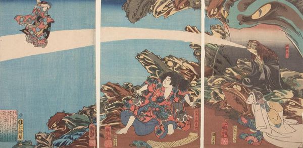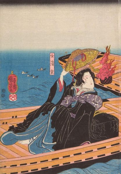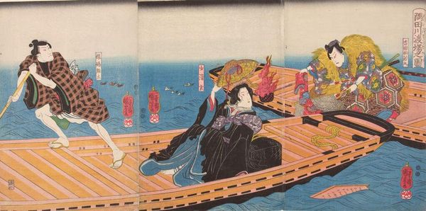 Curator: This woodblock print, currently held at the Harvard Art Museums, is titled "Sumida River Crossing" and was created by Utagawa Kuniyoshi, who lived from 1797 to 1861. Editor: There's such intense energy, almost frantic, in this image. The figure, with that straw overcoat, looks caught in a moment of frantic escape across the water. Curator: Absolutely, this work resonates strongly with themes of marginalization and the struggle for survival in Edo-period Japan, considering Kuniyoshi's focus on societal outcasts and the narratives he often depicted. The figure's attire, while seemingly rustic, points towards a deeper commentary on class and status. Editor: I’m also drawn to the composition. The almost brutal diagonal of the boat slices through the space, creating a sense of urgency. And that single rudder? Vulnerable! Curator: The rudder's presence, or lack thereof, speaks volumes about agency and control, or rather the lack thereof, within the context of the Sumida River as a historical and symbolic space of transit and transformation. Editor: Right? Like a desperate prayer cast upon the current. I guess it’s just a feeling, but this piece really speaks to the fragility of life, you know? Curator: Indeed, the piece invites us to reflect on broader themes of resilience, resistance, and the precariousness of existence.