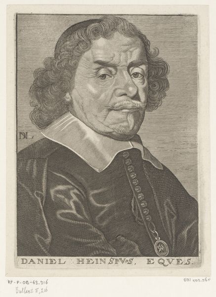 Curator: Here we have a work entitled "Portret van Christoph Molitor," dating back to 1663. The artist rendered this portrait using engraving on metal. Editor: My initial impression is one of reserved opulence. The subject’s posture and gaze exude authority, framed by the intricate detail of the Baroque style. It feels simultaneously intimate and grand. Curator: The engraving process itself contributes significantly to the overall effect. Consider the labor involved: each line, each curve meticulously carved into the metal. The result is a study of contrasts: light and shadow dance across Molitor’s face, capturing a palpable sense of weight and presence. Editor: I see your point, but the way the engraver modulates tone and texture through line work also establishes form and depth, effectively constructing the three-dimensional figure of Molitor within the two-dimensional plane. The success of this image resides in the visual interplay. Curator: Indeed, and beneath the portrait, we see Latin text which serves to elevate Molitor, aligning him with classical ideals. The act of portraying him in this specific manner underscores the subject’s societal standing. This also demonstrates the power of art to perpetuate social structures. Editor: Perhaps, but I think the material specificity adds another layer. Metal engraving was considered both high art and a trade; Molitor, the person being portrayed and immortalized through a medium, simultaneously elevates the craftsman to the level of artist. Curator: I appreciate you highlighting the process. Examining "Portret van Christoph Molitor," through both the lens of technique and that of visual structure gives a much fuller understanding of what this work communicates to us. Editor: Precisely. It pushes us to consider not just the what but also the how and the why of artmaking.