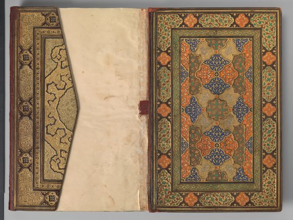 Editor: Here we have the “Binding and Text-Block for the Mantiq al-Tayr (Language of the Birds)”, made sometime between 1575 and 1625. It's attributed to Farid al-Din `Attar and uses mixed media and gold, even textiles. It feels so intricately designed and purposeful. What layers are at play here, and what am I not seeing? Curator: This isn't just a pretty object; it’s a testament to cultural preservation and knowledge dissemination within a specific historical context. The bookbinding itself elevates the text to something sacred. Have you considered how the geometric patterns and calligraphy act as a visual language, speaking to those within the culture even before the text is read? Editor: I hadn't thought about it that way. It's like the cover is preparing you for what's inside, creating a sense of anticipation. And that intricate design seems incredibly time-consuming, implying a high value was placed on the book’s contents. Curator: Precisely. In a time where access to knowledge was restricted, illuminated manuscripts like this were potent symbols of power and spiritual enlightenment. The materials themselves, the gold and fine textiles, represent wealth and patronage. But it also speaks to the artistic traditions in manuscript creation and binding - traditions that might marginalize certain groups of artisans. How might those systems of patronage have shaped whose stories got told? Editor: So it’s not just about the beauty; it’s about power, access, and who controlled the narrative. Thinking about the unseen labour and social structures really changes how I see the artwork. Curator: Exactly. And that's why engaging with the art of the past necessitates understanding its relationship to the present, to critique not just the aesthetics but the politics of representation and legacy. Editor: This makes me see decorative arts in a whole new light – far from mere ornamentation. Thanks! Curator: Indeed, it holds so much value as a cultural record, and its impact on subsequent artistic movements is undeniable. I learned so much today too.