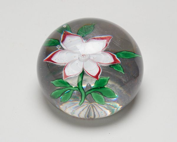 Curator: What a find, this "Paperweight" created by Baccarat Glass Works around the 19th century, currently held at the Minneapolis Institute of Art. You can practically smell the faint scent of a bygone desk, can't you? Editor: It has an almost scientific, contained beauty. Like a preserved specimen, but also… luxurious. There’s something compellingly precious about its glass and floral core. What kind of glass artistry would you say went into something like this? Curator: Well, creating these exquisite paperweights often involved complex techniques such as lampworking for the delicate flowers and millefiori for those colourful cane slices forming the border, then everything is carefully encased in molten crystal. Each component is a miniature act of labour, meticulously crafted and assembled, right? I wonder how the artisans viewed this kind of work - was it art or craft or commodity? Editor: I imagine a great deal of skill went into both its making, which elevates this far beyond commodity. There’s a fascinating tension here, I think, the intended use and the artistry. It's this combination of function and adornment. Think about all the Victorian writers, officials, ladies whose letters this might have weighed down! What untold narratives rested beneath it? The social history alone gives this object such depth. Curator: Absolutely. The encased blooms remind me that everything beautiful, in time, is stopped… suspended in amber for the gods! Is that melancholy too intense? It whispers of fleeting moments of beauty, immortalized through art and human endeavor. Editor: Not at all! I’m picturing that slow, meticulous process too – I would assume there must be entire lineages that revolved around paperweights. But it must also be a reminder of the weight of bureaucracy or a love letter carefully weighed to maintain privacy. These domestic scenes are so crucial to material understandings. Curator: This glass tomb, sealing up these precious blooms serves both purposes. Perhaps these "useless" moments are anything but. They tell our histories too! And each delicate little detail of flower and glass carries meaning… doesn’t it? Editor: Indeed, objects such as this reveal intricate stories about artistry, industry, and everyday life within a certain social era. Thanks for shedding light on the history beneath its glittering, flawless surface. Curator: Likewise! It is fascinating what one can divine when something is simply looked at closely.